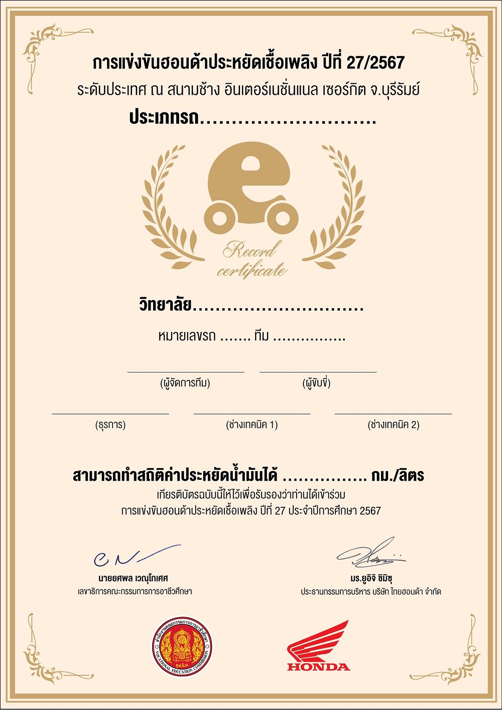 การแข่งขันฮอนด้าประหยัดเชื้อเพลิง Honda Eco Mileage Challenge คือ การแข่งขันบนพื้นฐานแนวความคิดที่ว่า “น้ำมัน 1 ลิตร จะสามารถวิ่งไปได้ไกลแค่ไหน” โดยมีเป้าหมายให้ทุกคนได้สนุกสนานไปกับการประดิษฐ์ คิดค้น ทดสอบ ทดลอง พร้อมกับคำนึงถึงการเป็นมิตรต่อสิ่งแวดล้อมให้มากขึ้น